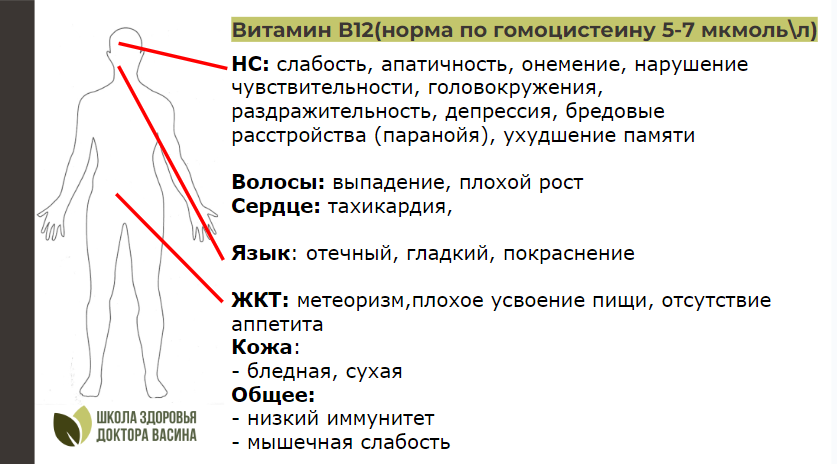 Витамин B12. Лучше всего отслеживать по показателю крови — гомоцистеин. Оптимально значение 5-7 мкмоль/л. Повышение свидетельствует о дефиците витамина В12.